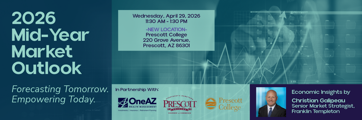OneAZ Wealth Management is proud to partner with the Prescott Chamber of Commerce and Prescott College for the 5th Annual 2026 Economic Outlook Luncheon. Registration is now open for this year’s event which will be held at a new venue—Prescott College.